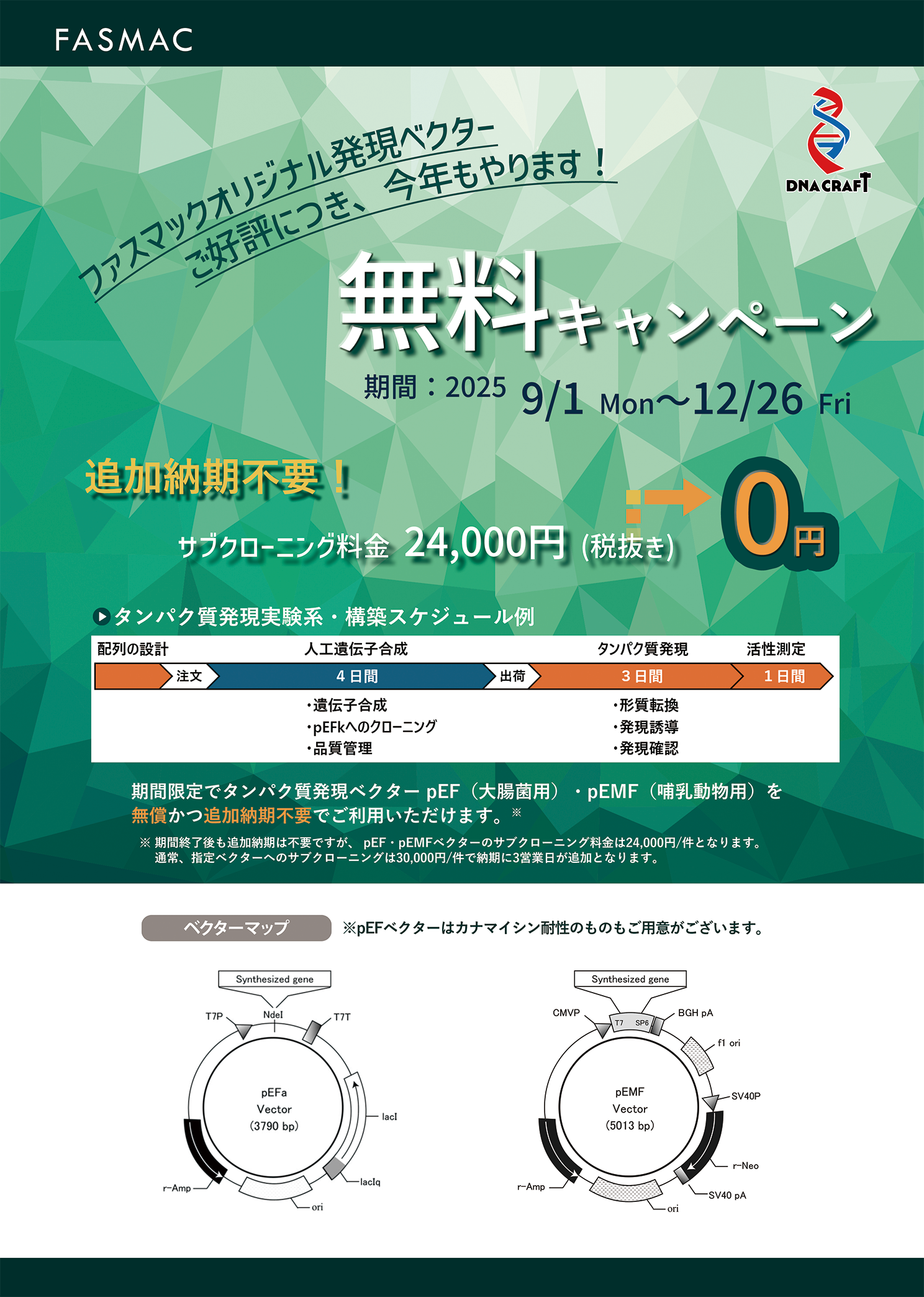 ご好評につき、人工遺伝子合成サービスの「発現ベクター無料キャンペーン」を実施します!