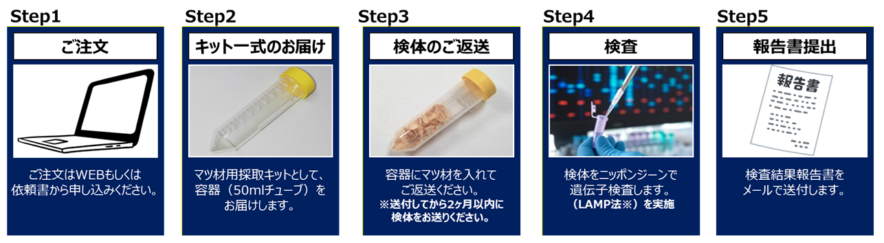 本サービスは、お客様よりお送り頂きました「マツ材片」(検体)を「マツ材線虫病診断キット」を用いて遺伝子検査によって病原体のマツノザイセンチュウの有無を検査するサービスです。